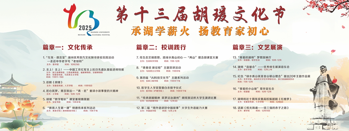 為弘揚胡瑗先生“明體達用”的教育思想,11月16日晚,人文學院原創話劇《胡瑗》在大學生活動中心上演,本次演出由校黨委宣傳部、人文學院主辦,吸引全校近500名師生到場觀看?! ≡拕 逗ァ啡珓》譃槿?,以說書人的念白引出胡瑗先生一生的幾個重要階段,生動呈現了胡瑗先生的求學、教書與育人經歷。該劇不僅藝術化地闡釋了胡瑗先生所倡導的“明體達用”教育思想及其創立的“分齋教學”教育制度,更充分彰顯了他堅韌不拔的治學精神與前瞻開放的教育理念。今年,《胡瑗》在去年劇本的基礎上進一步創新,著重改進了說書人的臺詞表達,使其更貼近青年的語言習慣與觀察視角,力求打造一部更能引起當代大學生共鳴的話劇作品?! ?,啟明劇社自2018年起以傳播胡瑗教育思想、承揚“明體達用”校訓為宗旨,進行話劇《胡瑗》的創作與演出,八年來,《胡瑗》話劇不斷被演繹、打磨、傳播,已成功上演十余場,吸引了萬余名名觀眾,產生了廣泛的社會影響。2020年“啟明劇社”獲評首屆文化“白天鵝獎”文化建設獎,2023年話劇《君子胡瑗》獲評第三屆文化“白天鵝獎”文藝創作獎,同年參與了湖州市新聞傳媒中心紀錄片《瑗來是湖州》的拍攝,相關內容在浙江衛視