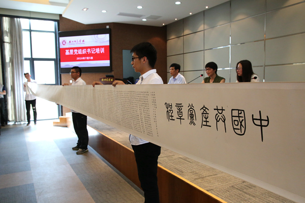會議表彰了2016年學校黨建和思政研究優秀論文、“十三五 話擔當”微黨課比賽獲獎人員、“兩學一做”全省大學生知識競賽優秀組織獎獲獎單位等。據悉,經各二級黨組織積極宣傳發動,全校共有6604名學生參加了“兩學一做”全省大學生知識競賽,參與率名列全省高校第3位,學校獲優秀組織獎。會上,理學院黨委書記王海華向學校贈送了耗時兩個月精心創作的絹書作品《中國共產黨章程》,黃建平代表學校為其頒發了作品收藏證書。