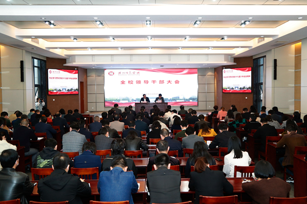11月18日下午,我校召開全校領導干部會議,傳達學習貫徹黨的十九屆六中全會和省市領導干部會議精神。會議由校黨委書記金佩華主持。