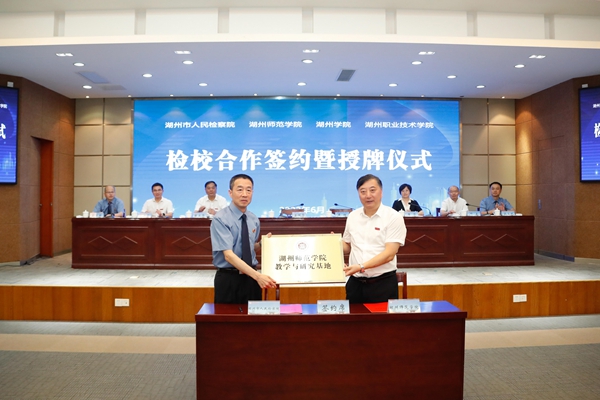 在隨后舉行的檢校合作簽約暨授牌儀式上,黃輝依次與我校、湖州學(xué)院和湖州職業(yè)技術(shù)學(xué)院簽約,并為三所高校教學(xué)與研究基地授牌。