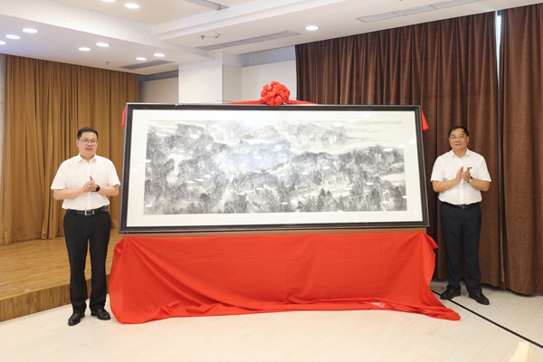 溫建飛與陳永華共同為學校向南潯區(qū)捐贈水墨畫《裊裊云煙撫潯溪》揭幕,此幅作品由我校藝術學院王鳳欣老師以南潯古鎮(zhèn)中代表性景物為主題創(chuàng)作完成。
