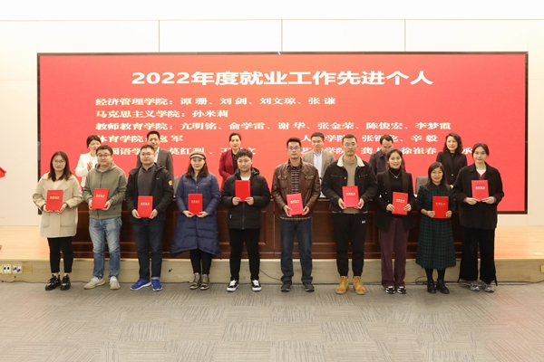 丁敢真宣讀表彰文件。體育學院、教師教育學院、人文學院、生命科學學院等4個學院被評為2022年度招生工作先進集體;理學院、藝術學院、醫學院、護理學院、經濟管理學院等4個學院被評為2022年度就業工作先進集體;陳偉揚等18人被評為2022年度招生工作先進個人;譚珊等33人被評為2022年度就業工作先進個人。與會領導為獲獎的先進集體和個人頒獎。