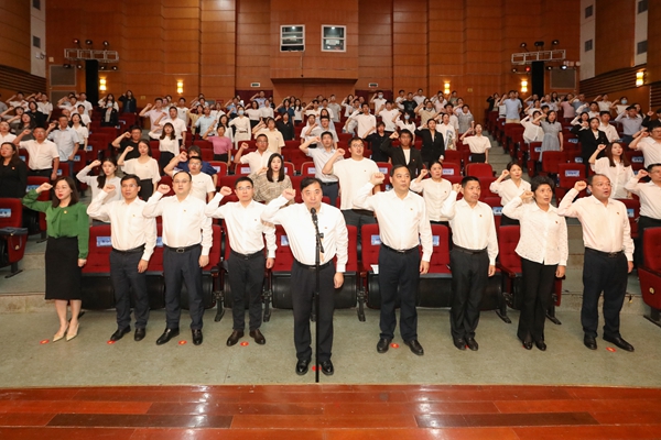 面向鮮紅的黨旗,校黨委書記金佩華帶領師生黨員重溫入黨誓詞。