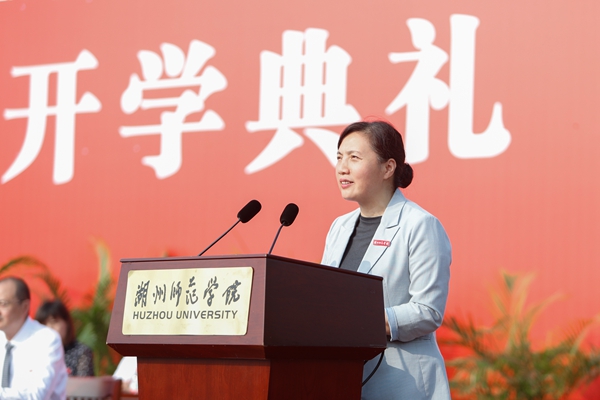 典禮上,許慧霞以《大道如砥 行者無疆》為題寄語新生,代表學校對2023級新同學表示熱烈歡迎。她說:“天下湯湯,道路萬千。來自五湖四海的新同學們沿著不同的道路匯聚湖師,道路將我們與你們相連,將夢想與現實相連,也將過去、現在與未來相連。”她以“道路”二字切入主題,并引申出“道”,指出“道”是軌跡、是行動、亦是真理。同學們正是用自己的腳步追隨著中華民族的復興之路、強國之路。作為師長,許慧霞與新同學們分享了三點建議:一是矢志不移,堅守天下為公的人生之道。一代代湖師人奮斗在國家經濟社會建設的各條賽道上,創造了巨大的社會價值。同學們要以前行者為榜樣,厚植家國情懷、勇擔時代使命,用腳步丈量祖國大地,用眼睛發現中國精神,用耳朵傾聽人民呼聲,用內心感應時代脈搏,用青春之履在祖國大地上留下最堅定、最踏實的足跡。二是勤學不怠,走好成長成才的大學之道?!按髮W之道,在明明德,在親民,在止于至善。”大學的正道,就是通過正己修身、格物致知來革新自我與民眾,并努力達到盡善盡美的境界。大學之道絕非單一局限、一馬平川,學校搭建了高度個性化的人才培養體系和“一站式”學生社區與成長陪伴智慧平臺,幫助大家充分開闊學術視野,開拓出屬于自己的最優成長路徑。三是步履不停,踏上擁抱未知的突破之道。當前世界百年未有之大變局加速演進,不斷擴大的未知圈時刻都在呼喚新的變革與突破。同學們生逢其時,走在強國建設、民族復興的康莊大道上,重任在肩,愿同學們不忘來時路、不負今朝景,踔厲奮發、篤行不怠,讓青春在為祖國、為人民、為民族、為人類的人間正道中綻放出更加絢麗的光彩。