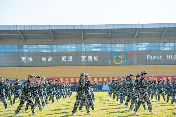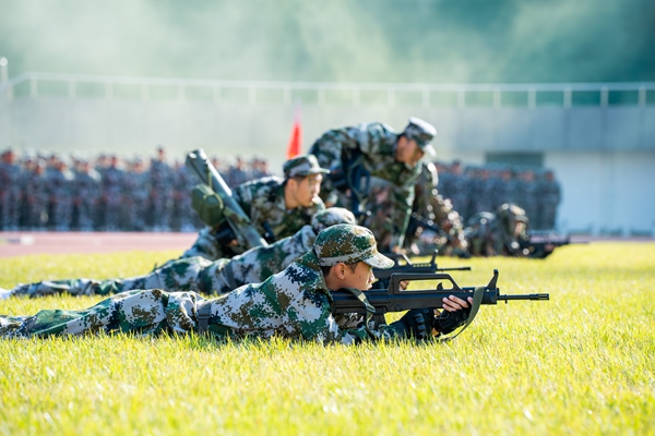 烈日長空著戎裝,蒼穹之下斗志昂。伴隨著氣勢磅礴的分列式進行曲,各營方陣昂首闊步,依次通過主席臺檢閱。堅定的步伐,整齊的揮臂,昂揚的姿態,挺拔的身軀,連貫的動作,展現出青春的朝氣和鋼鐵般的意志。