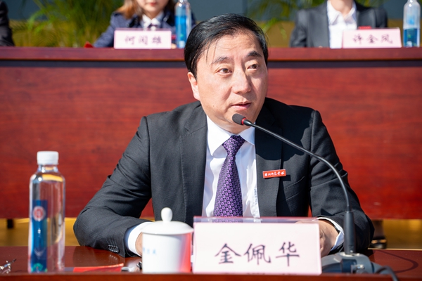 金佩華向承訓部隊贈送錦旗并代表學校向承訓部隊表示感謝,向從事軍訓組織和保障工作的各位老師致以誠摯問候,向2023級全體新生表示熱烈祝賀。