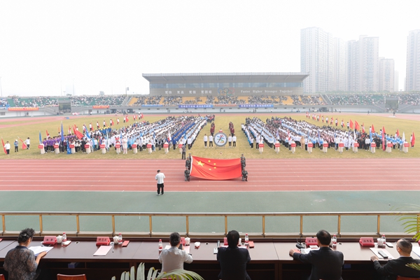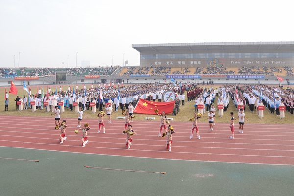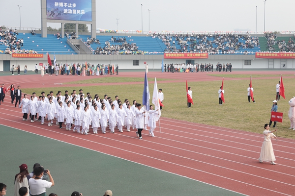 伴隨著雄壯的《運(yùn)動員進(jìn)行曲》,國旗護(hù)衛(wèi)隊(duì)、校運(yùn)動會會徽隊(duì)以及全體裁判員、運(yùn)動員邁著整齊的步伐,精神飽滿地步入運(yùn)動場。各代表隊(duì)的方陣依次走過主席臺前,向師生們展現(xiàn)著青春風(fēng)采。
