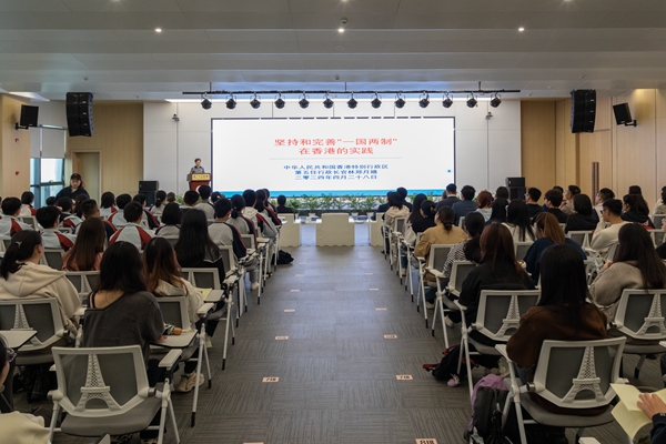 報告會上,林鄭月娥女士以《堅持和完善“一國兩制”在香港的實踐》為主題,從回顧歷史、香港特區(qū)的憲制秩序、特區(qū)行政長官的憲制地位、堅持和完善“一國兩制”的實踐、教育的重要性等五個方面講授了“一國兩制”在香港的實踐,分享了自己在擔(dān)任第五任行政長官期間的體會感悟和香港如何發(fā)揮“背靠祖國,聯(lián)通世界”優(yōu)勢更好融入國家發(fā)展大局,表達(dá)了對香港未來的信心。