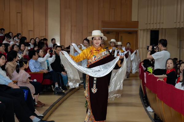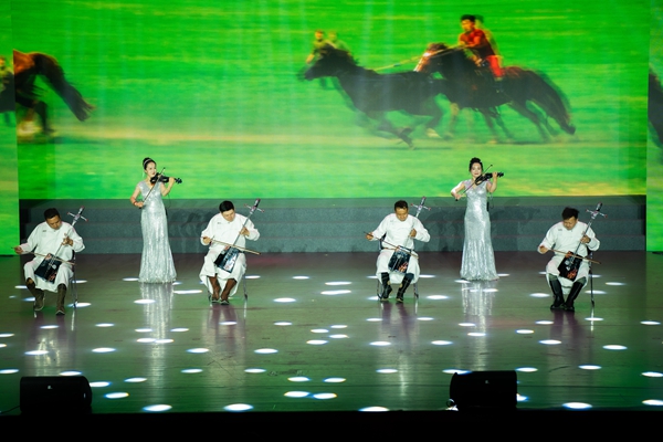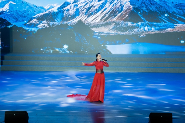 女聲獨(dú)唱《青藏高原》中的女高音清亮動人,讓觀眾如身臨其境,感受到海西州震撼人心的高原風(fēng)光。器樂聯(lián)奏《愛在海西》將中西樂器合璧,描繪出海西文化的絢爛璀璨,深情的旋律中盡是海西人民對家鄉(xiāng)與祖國的熱愛。群舞《那達(dá)慕盛會》《弦音鼓舞》融入蒙古族獨(dú)有民俗元素的舞蹈設(shè)計(jì),展現(xiàn)了少數(shù)民族善騎善射、能歌善舞的品質(zhì)。在歌舞《馬背上的民族》中,熱情的高原兒女走下舞臺,將潔白的哈達(dá)和一碗碗酥油茶獻(xiàn)給在場嘉賓,將現(xiàn)場氣氛推向高潮。