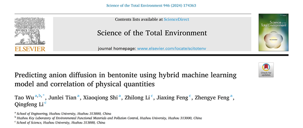 近日,我校工學院材料科學與工程系伍濤教授(第一和通訊作者)以我校為第一單位在化學領域知名期刊《Science of the Total Environment》(中科院一區(qū)TOP,IF:8.2)上,發(fā)表題為 “Predicting anion diffusion in bentonite using hybrid machine learning model and correlation of physical quantities” 的研究文章。