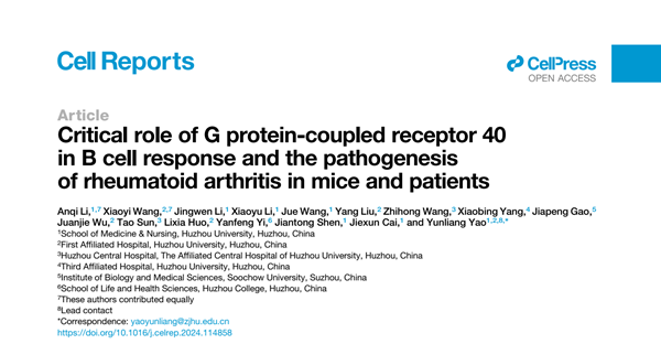 近日,我校醫學院/護理學院及附屬第一醫院李安琪老師(第一作者),王霄一教授(共同第一作者),姚韻靚教授(通訊作者)以我校為第一單位在Cell知名子刊《Cell Reports》(中科院一區TOP,IF:7.5)上,發表題為 “Critical role of G protein-coupled receptor 40 in B cell response and the pathogenesis of rheumatoid arthritis in mice and patients” 的研究文章。附屬第一醫院、附屬中心醫院、第三人民醫院的相關臨床團隊參與了項目研究。