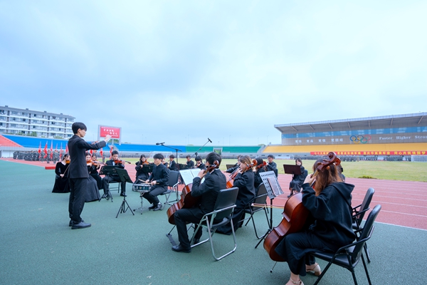 軍訓表演中,音樂學院管弦樂團的師生們帶來了紅色樂曲演奏《鋼鐵洪流進行曲》。激昂的旋律仿佛再現了鋼鐵雄師一往無前的豪邁氣魄,讓軍訓場上的同學們熱血沸騰,心中涌起強烈的愛國之情和民族自豪感,激勵著大家以更加堅定的信念和昂揚的斗志,邁向未來的學習與生活。