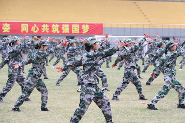 匕首操團隊由教師教育學院和人文學院的198名女兵組成,她們化身女戰士,用熱血和激情,演繹了巾幗不讓須眉的氣魄和精彩。她們以昂揚的姿態、颯爽的英姿,成為校園中一道最亮麗的風景線。