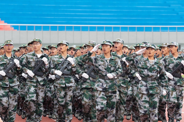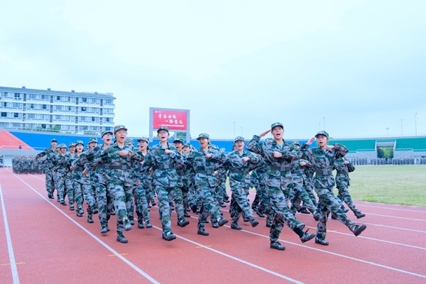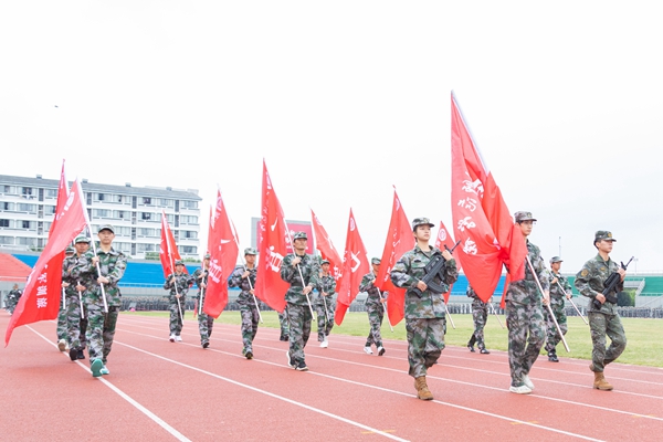 分列式表演中,旅旗和各營營旗組成顯赫軍旗方陣,緊隨其后的是本次軍訓首次亮相的持槍方陣,由經濟管理學院64名學生組成,他們肩扛時代重任,以軍人的颯爽英姿,展現了當代青年的蓬勃朝氣和風采。隨后,各學院組成的方陣依次經過主席臺接受檢閱。他們步伐整齊,口號嘹亮,每一個方陣都猶如一支訓練有素的軍隊。他們以昂揚的斗志、飽滿的精神,向全校師生展示著新時代大學生的風采與活力。