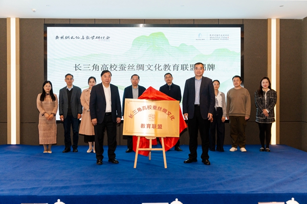 開幕式上,金佩華和姚菊明共同為長三角高校蠶絲綢文化教育聯盟揭牌。