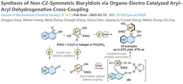 近日,我校生命科學學院藥學系青年教師宋定國以第一作者身份在國際著名學術期刊《J. Am. Chem. Soc.》(中科院一區TOP,IF = 14.4)上發表題為“Synthesis of Non-C2-Symmetric Biaryldiols via Organo-Electro Catalyzed Aryl–Aryl Dehydrogenative Cross-Coupling”的研究成果,論文通訊作者是浙江工業大學藥學院鐘為慧教授和凌飛副教授。