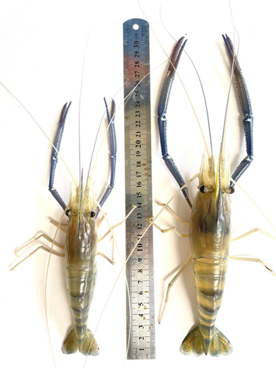 ▲羅氏沼蝦“數豐1號”(左雌右雄)