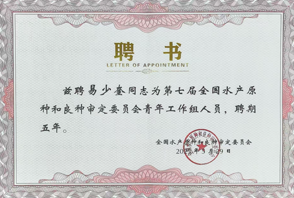 會議宣布了第七屆全國水產原種和良種審定委員會委員、第七屆全國水產原種和良種審定委員會顧問委員會和青年工作組組成人員名單。我校生命科學學院水產系羅氏沼蝦遺傳育種團隊帶頭人、原國家蝦蟹產業技術體系羅氏沼蝦種質資源與品種改良崗位科學家楊國梁研究員當選為顧問委員會委員,團隊骨干唐瓊英研究員當選為審定委員會委員,團隊青年骨干、現國家蝦蟹產業技術體系羅氏沼蝦種質資源與品種改良崗位科學家易少奎教授當選為青年工作組成員。