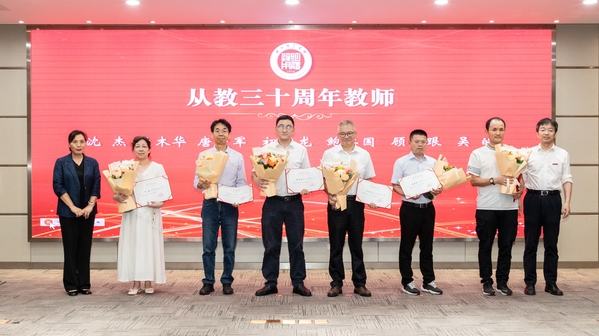 會上,校黨委副書記陳永華宣讀從教30周年教師名單。許慧霞、盛況為從教30周年教師頒發證書。