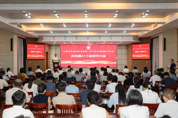 9月10日下午,學校召開慶祝第41個教師節大會。校領導班子成員出席,黨委辦公室(校長辦公室)、教師工作部、人事處和各二級學院負責人,從教30周年教師及2025年新入職教師參加會議。會議由副校長(主持行政日常工作)盛況主持。
