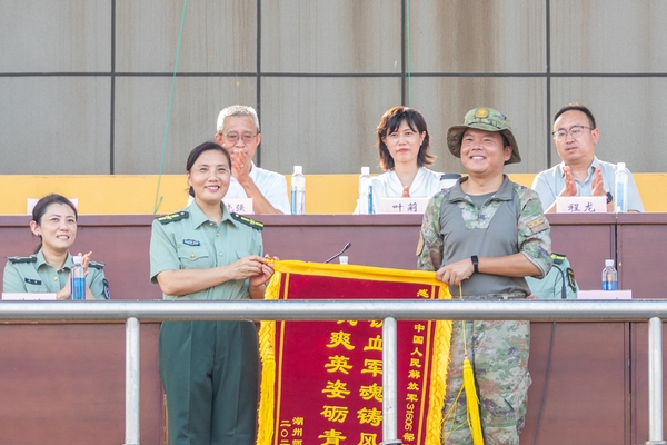 許慧霞向軍訓教官和教導員代表贈送榮譽獎章,向承訓部隊贈送錦旗。她代表學校向承訓部隊表示感謝,向從事軍訓組織和保障工作的各位老師致以誠摯問候,向2025級全體新生表示祝賀。她指出,軍訓不僅是大學的“開學第一課”,更是青年學子人生路上的“成長淬煉營”。她殷切寄語新生:愿大家在未來四年里,始終保持熱忱、勇敢追逐夢想,實現從“會讀書的人”到“會創造的人”的蛻變,最終成長為“胸有大愛、本領過硬、團結包容”的湖師新青年,在青春的賽道上跑出屬于自己的精彩。