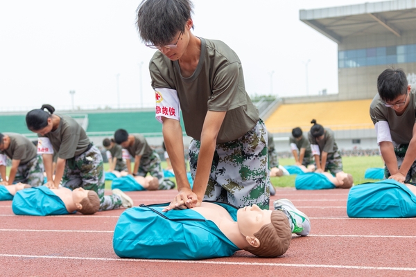 特色科目展演環節,十四營醫學院學生化身“生命守護者”,以規范動作演示心肺復蘇、止血包扎、骨折固定與傷員搬運等應急救護技術,生動傳授急救技能,將人道主義精神與醫者責任感深植于心。四營教育學院(教師教育學院)和二營經濟管理學院的225名女兵帶來的匕首操表演,用整齊劃一的動作、清脆嘹亮的口號,完美詮釋了剛柔并濟之美,展現了當代女大學生自信自強、勇于挑戰的風采。來自十一營信息工程學院的132名學生帶來了緊張激昂的戰術表演,表演貼近實戰,通過翻滾、躍進、掩護、射擊等動作的組合,模擬戰場環境,動作逼真,配合默契,展現了良好的戰術素養和團隊精神。雖然訓練艱苦,但十營理學院的100名同學不畏艱難,手握模擬槍、有力突刺,展示了培養軍人血性膽氣和近戰能力的傳統課目——刺殺操,展現出勇往直前的戰斗精神和一往無前的豪邁氣概。