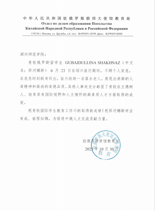 近日,中華人民共和國(guó)駐俄羅斯聯(lián)邦大使館教育處向我校致表?yè)P(yáng)信,表彰我校國(guó)際學(xué)生GUBAIDULLINA SHAKHNAZ(中文名莎河娜斯)6月23日在紹興旅行期間,不顧個(gè)人安危,在危急時(shí)刻挺身而出,奮力救助落水老人事跡。