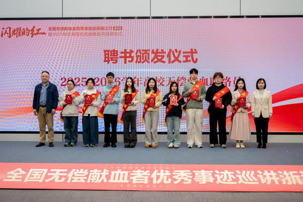 活動現場,黃桂眾、謝作靈為在湖各高校無償獻血聯絡員頒發聘書,進一步健全高校無償獻血工作聯絡機制。我校學生代表、全國無償獻血奉獻銀獎獲得者樓炯楠同學宣讀了《致全省青年學子的無償獻血倡議書》,發出“捐獻熱血、傳遞希望”的號召。