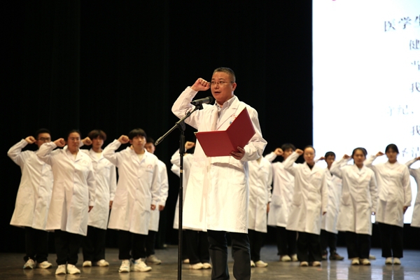 在附屬中心醫(yī)院副院長胡鴻宇的領(lǐng)誓下,2025級全體醫(yī)學(xué)生莊嚴(yán)宣誓。這既是對醫(yī)學(xué)事業(yè)的鄭重承諾,更是對青春使命的莊嚴(yán)宣告,彰顯了新一代醫(yī)學(xué)生的責(zé)任與擔(dān)當(dāng)。