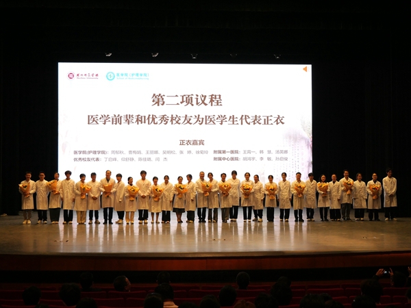 15位來自附屬醫(yī)院的醫(yī)學(xué)前輩、醫(yī)學(xué)院資深教師以及優(yōu)秀校友代表,共同為2025級醫(yī)學(xué)生代表正衣,并贈予醫(yī)學(xué)生誓言卡,寄托殷切期望。學(xué)生代表為15位醫(yī)學(xué)前輩獻(xiàn)花。