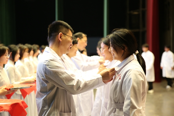 丁敢真代表學(xué)校向關(guān)心支持醫(yī)學(xué)教育的各界領(lǐng)導(dǎo)、醫(yī)護同仁及校友致謝,向新生致以問候。他指出,白衣加身意味著身份的轉(zhuǎn)變,前輩為新生扣上“第一粒扣子”,是初心與擔(dān)當(dāng)?shù)膫鞒?。他希望新生忠于選擇,將個人理想融入健康中國建設(shè);追求卓越,錘煉過硬醫(yī)術(shù);勇于突破,擁抱時代變革,做醫(yī)學(xué)疆域的“拓荒者”。