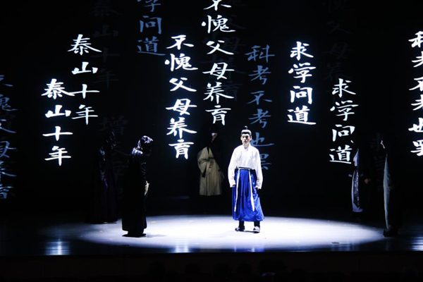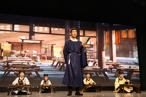 話劇《胡瑗》全劇分為三幕,以說書人的念白引出胡瑗先生一生的幾個重要階段,生動呈現了胡瑗先生的求學、教書與育人經歷。該劇不僅藝術化地闡釋了胡瑗先生所倡導的“明體達用”教育思想及其創立的“分齋教學”教育制度,更充分彰顯了他堅韌不拔的治學精神與前瞻開放的教育理念。今年,《胡瑗》在去年劇本的基礎上進一步創新,著重改進了說書人的臺詞表達,使其更貼近青年的語言習慣與觀察視角,力求打造一部更能引起當代大學生共鳴的話劇作品。
